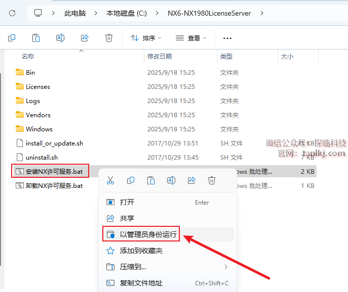 右键程序【安装NX许可服务】,点击【以管理员身份运行】。