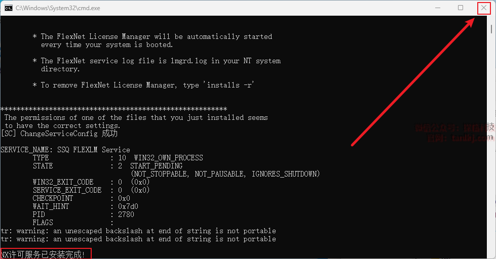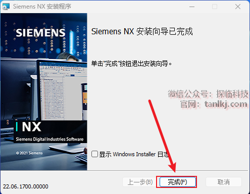 提示:NX许可服务已安装完成后,点击右上角【X】关闭窗口。