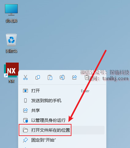在桌面,右键软件【NX】,点击【打开文件所在的位置】。