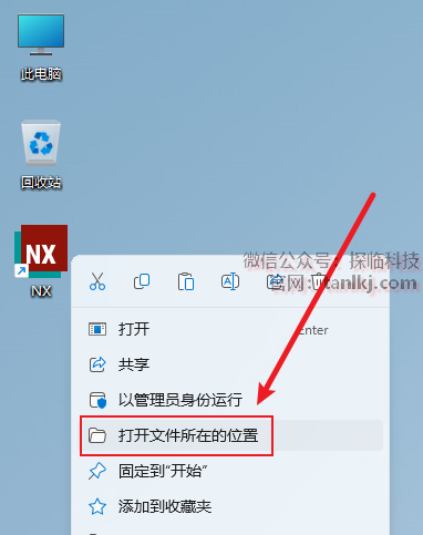 在桌面,右键软件【NX】,点击【打开文件所在的位置】。