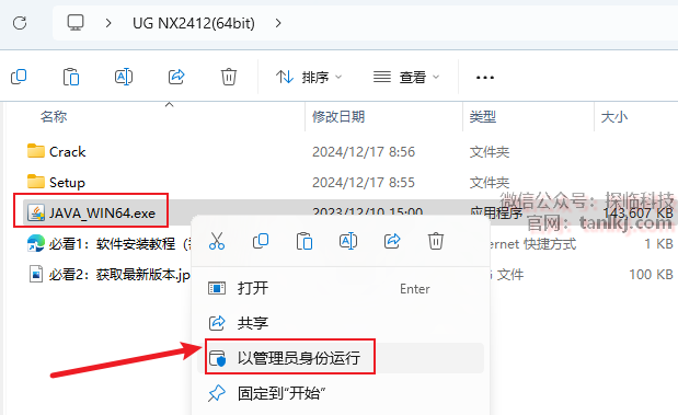 打开解压后的文件夹,右键程序【JAVA_WIN64】,点击【以管理员身份运行】。