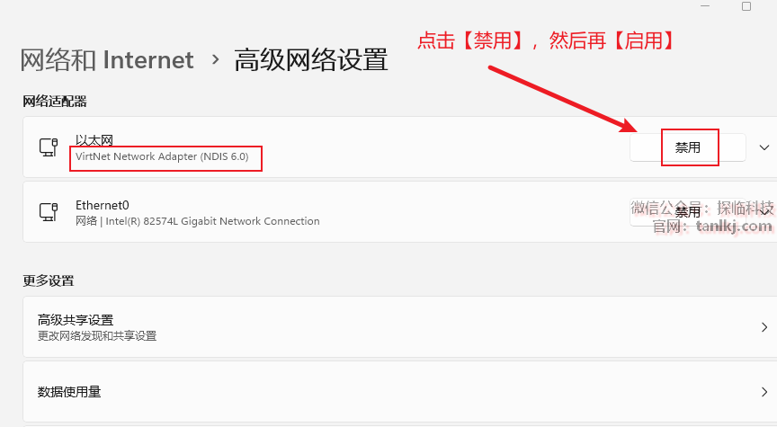 以太网(VirtNet Network Adapter)选项中,点击【禁用】后再点击【启用】。
