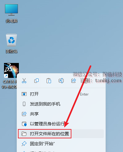 在桌面,右键软件【CATIA V5-6R2020】,点击【打开文件所在的位置】。