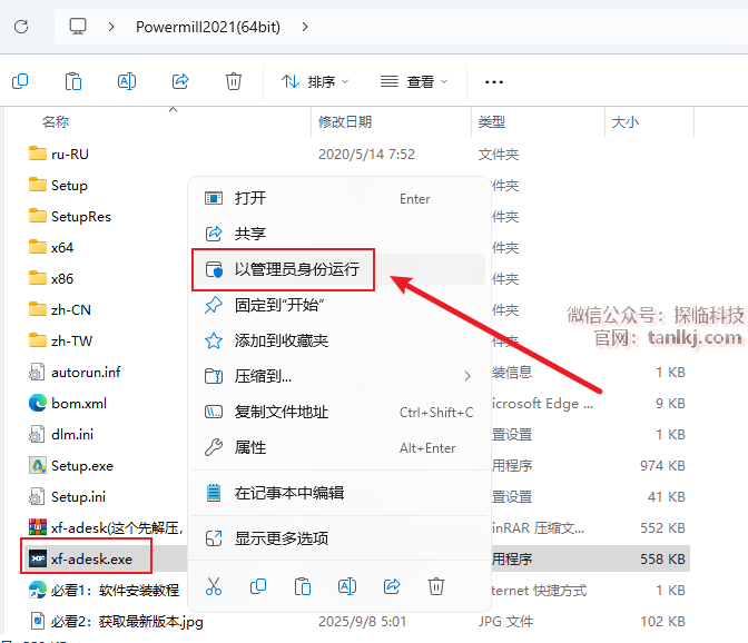 右键刚刚解压出来的文件【xf-adesk】,点击【以管理员身份运行】。