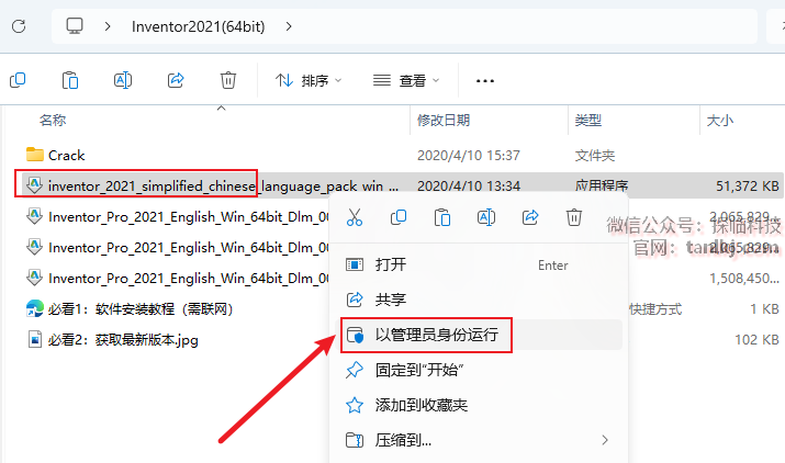 回到之前解压后的文件夹内,右键程序【inventor_2021_simplified_chinese…】,点击【以管理员身份运行】。