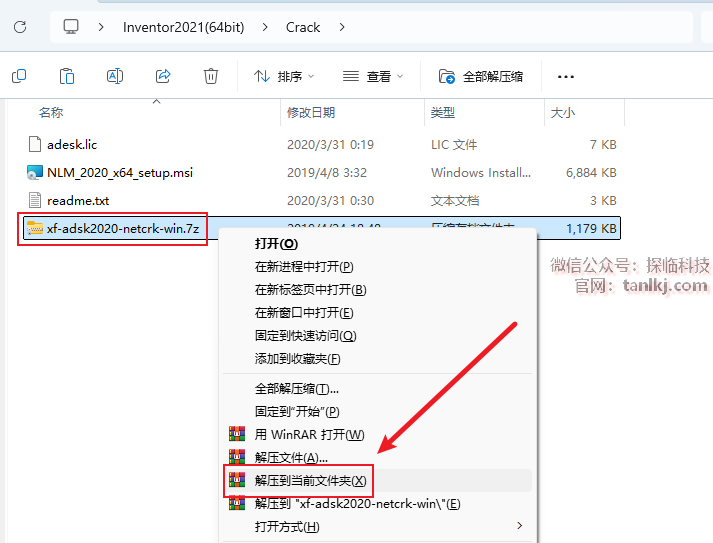 回到【Crack】文件夹中,解压文件【xf-adsk2020-netcrk-win】到当前文件夹。