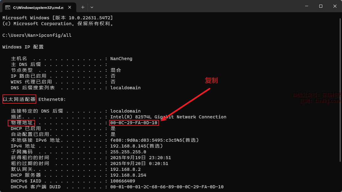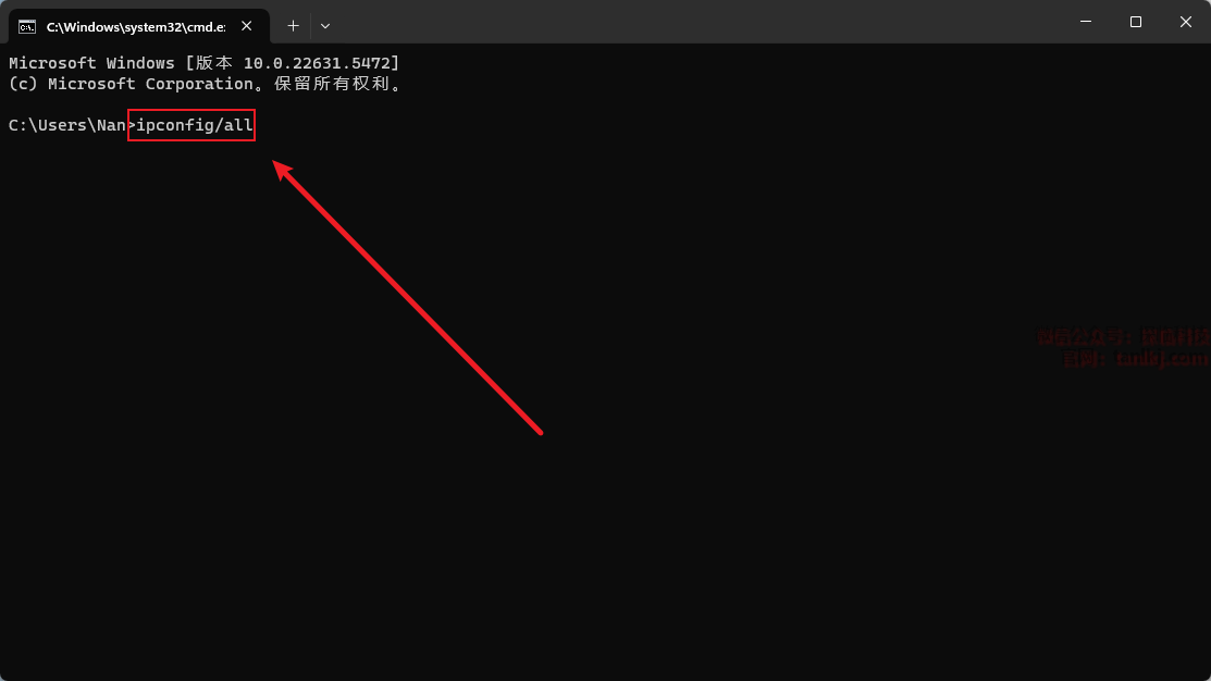 在弹出来的窗口中,输入:ipconfig/all,并按下回车键。