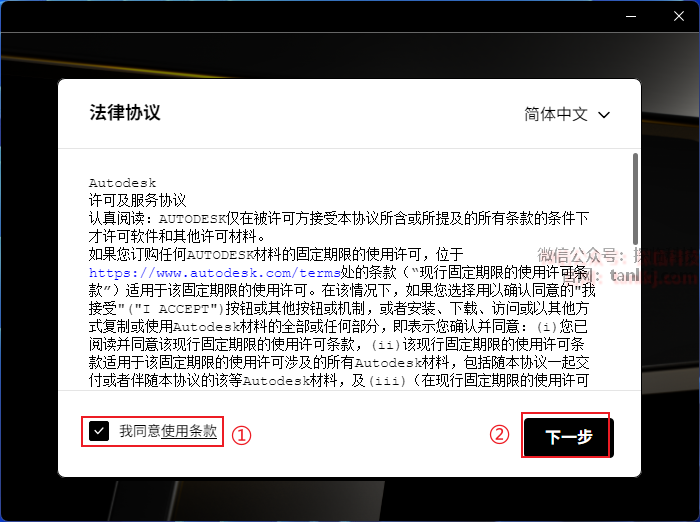 ①勾选【我同意使用条款】;