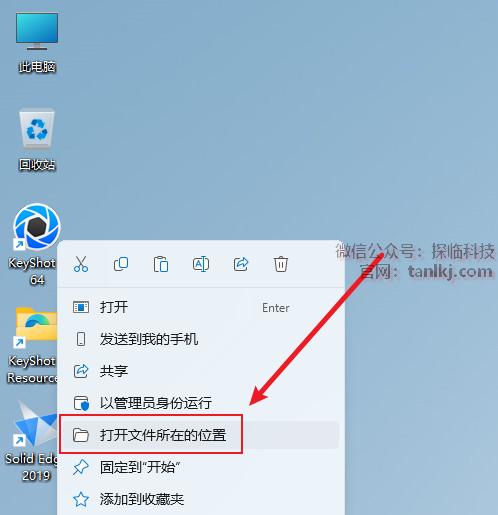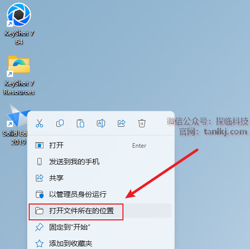在桌面,右键软件【Solid Edge 2019】,点击【打开文件所在的位置】。
