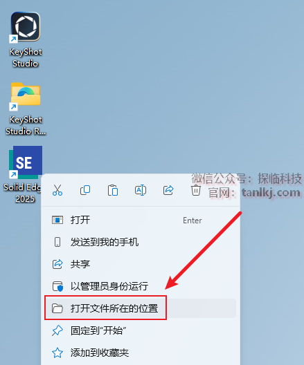 在桌面,右键软件【Solid Edge 2025】,点击【打开文件所在的位置】。