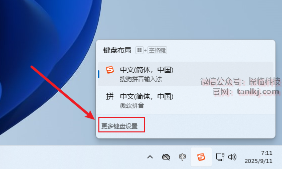 桌面右下角,单击输入法,点击【更多键盘设置】。