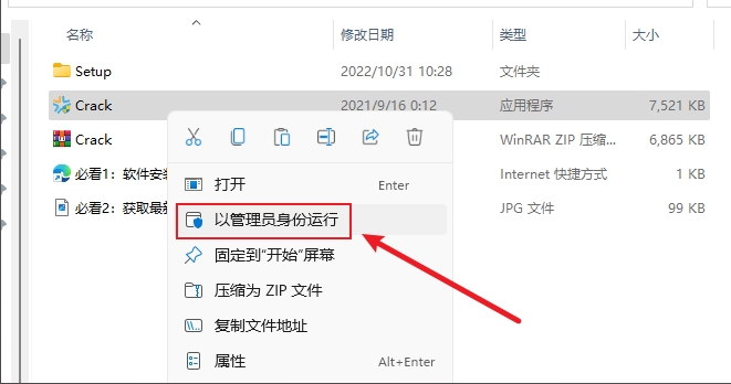 右键解压出来的程序【Crack】,点击【以管理员身份运行】。
