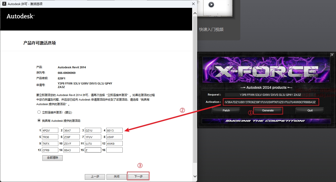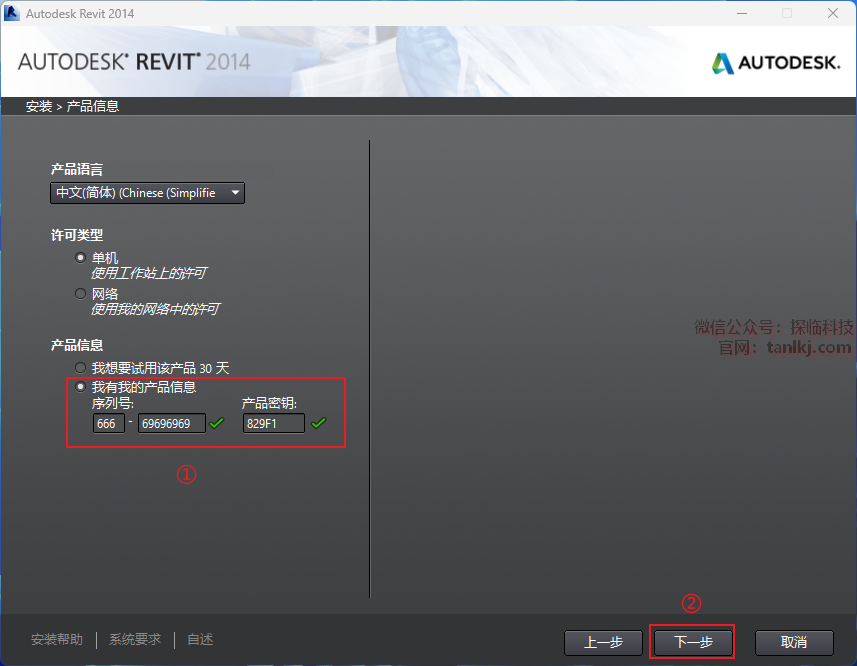 ①输入序列号和产品密钥: