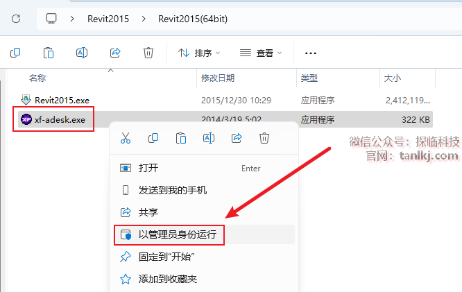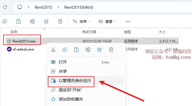 回到文件夹【Revit2015(64bit)】中,右键程序【xf-adesk】,点击【以管理员身份运行】。