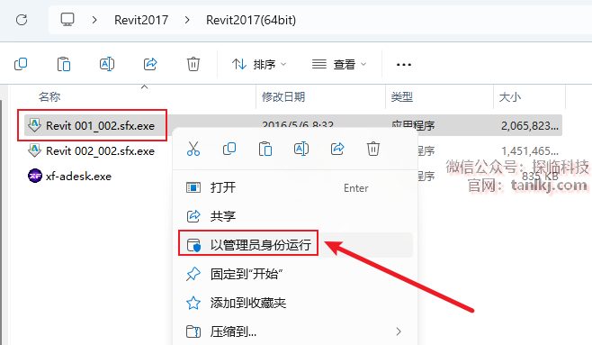 右键程序【Revit 001_002.sfx】,点击【以管理员身份运行】。
