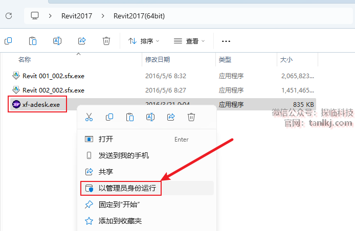 回到文件夹【Revit2017(64bit)】中,右键程序【xf-adesk】,点击【以管理员身份运行】。
