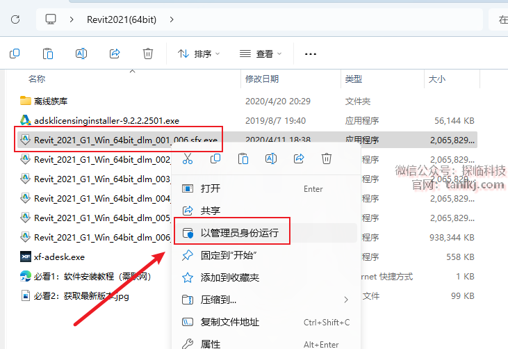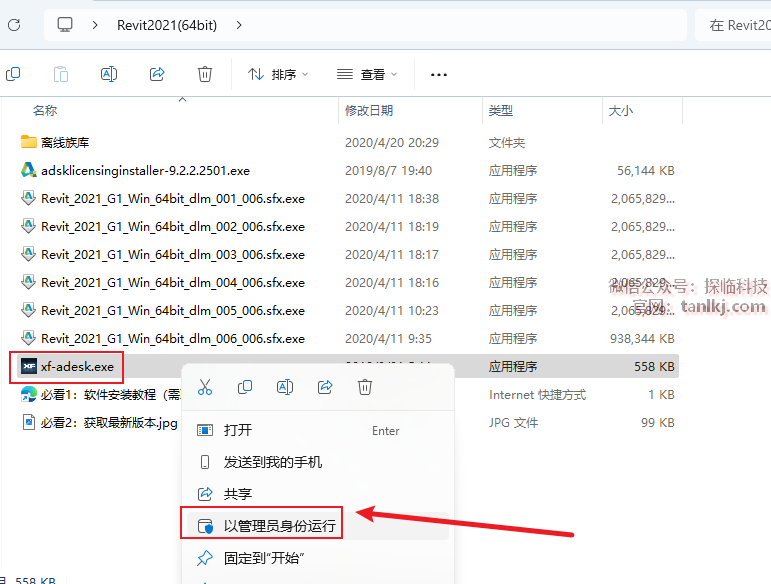 打开解压后的文件夹,右键程序【Revit_2021_G1…】,点击【以管理员身份运行】。