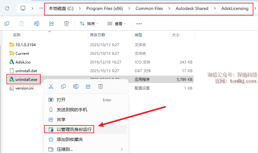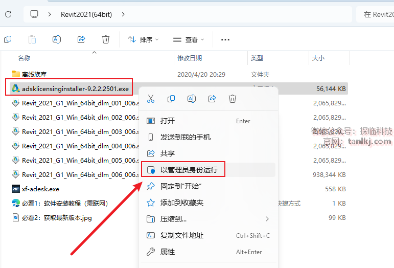 回到之前解压后的文件夹内,右键程序【adsklicensinginstaller-9.2.2.2501】,点击【以管理员身份运行】。