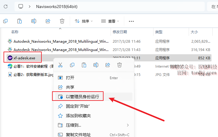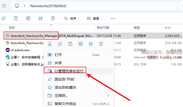 打开解压后的文件夹,右键程序【Autodesk_Navisworks…】,点击【以管理员身份运行】。