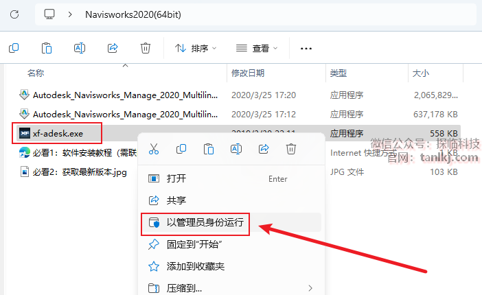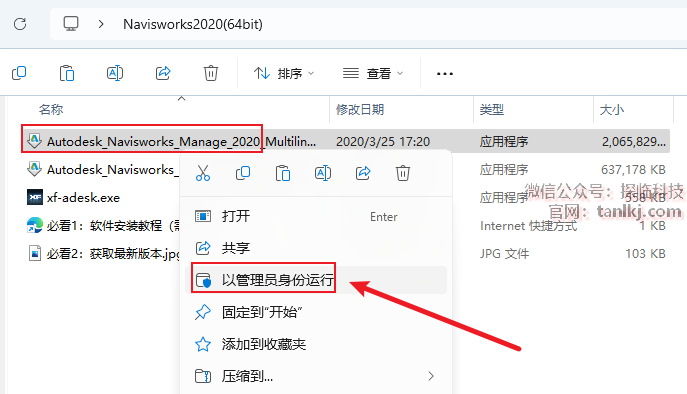 打开解压后的文件夹,右键程序【Autodesk_Navisworks…】,点击【以管理员身份运行】。