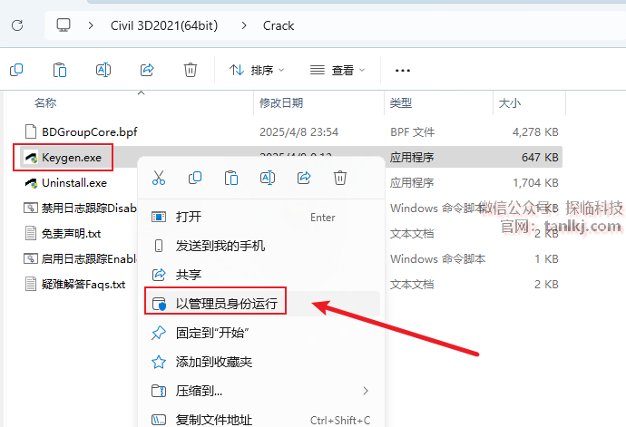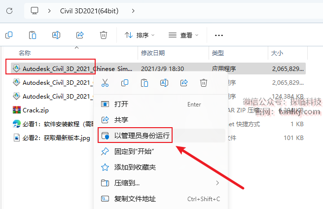 打开解压后的文件夹,右键程序【Autodesk_Civil_3D…】,点击【以管理员身份运行】。