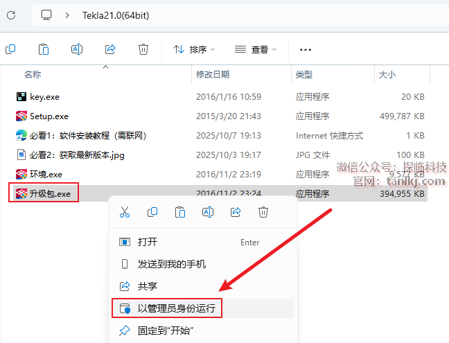回到之前解压后的文件夹中,右键程序【升级包】,点击【以管理员身份运行】。