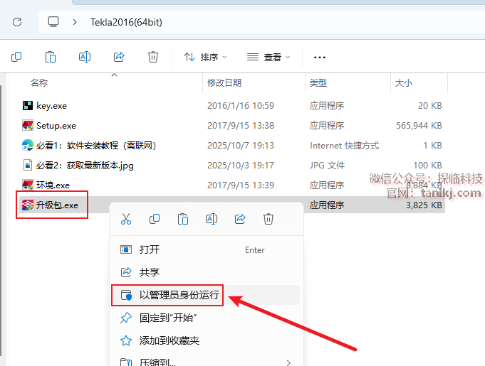 回到之前解压后的文件夹中,右键程序【升级包】,点击【以管理员身份运行】。