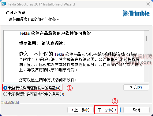 ①勾选【我接受该许可证协议中的条款】;