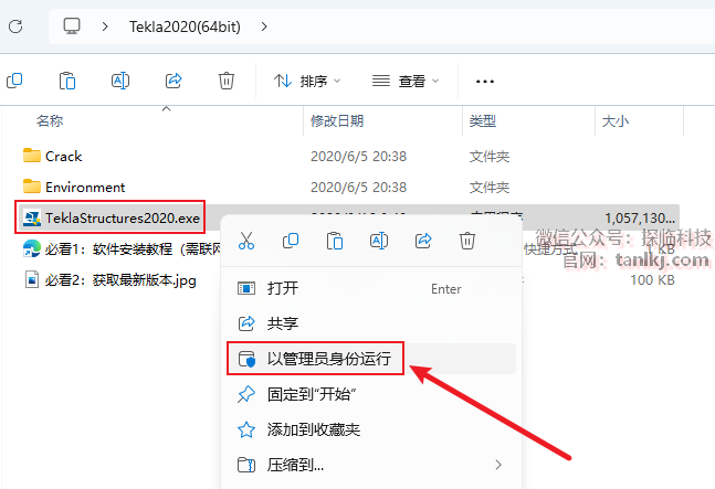 打开解压后的文件夹,右键程序【TeklaStructures2020】,点击【以管理员身份运行】。