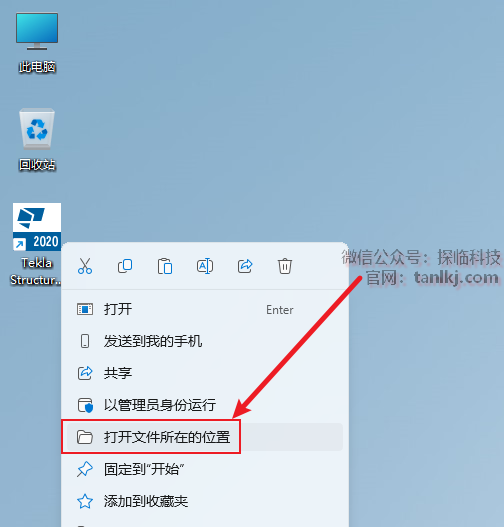 在桌面,右键软件【Tekla Structures 2020】,点击【打开文件所在的位置】。