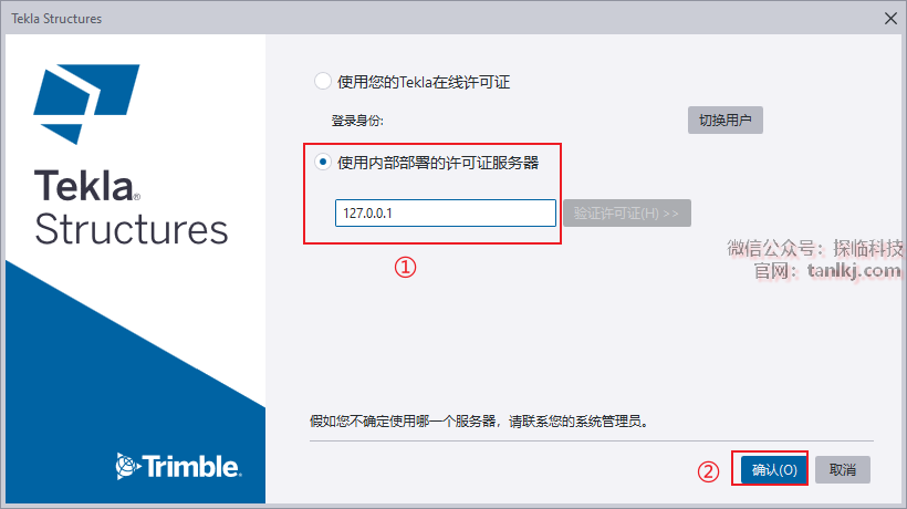 ①勾选【使用内部部署的许可证服务器】,并输入:127.0.0.1