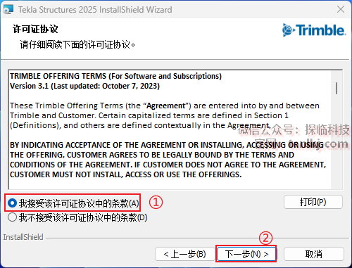 ①勾选【我接受该许可证协议中的条款】;