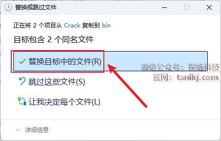 点击【替换目标中的文件】。