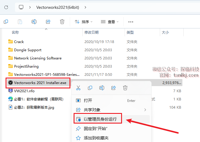 打开解压后的文件夹,右键程序【Vectorworks 2021 Installer】,点击【以管理员身份运行】。