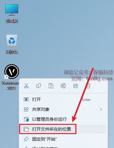 在桌面,右键软件【Vectorworks2021】,点击【打开文件所在的位置】。