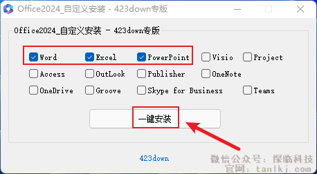 勾选所需要安装的产品,如:Word、Excel、PowerPoint,点击【一键安装】。