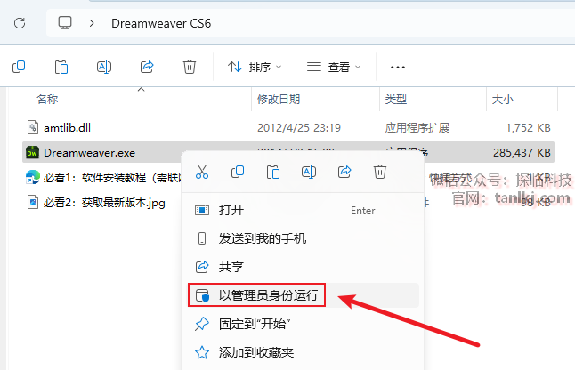 打开解压后的文件件,右键程序【Dreamweaver】,点击【以管理员身份运行】。