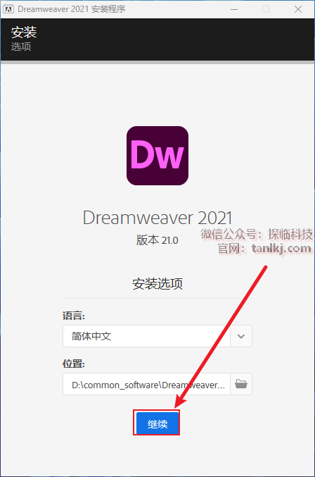 更改软件默认的安装位置,如不需更改,直接点击【继续】即可。