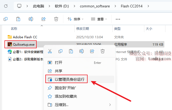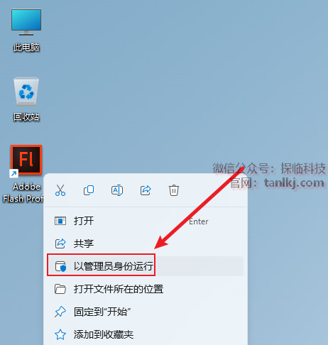 在桌面,右键软件【Adobe Flash Pro…】,点击【以管理员身份运行】。