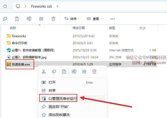打开解压后的文件夹,右键程序【快速安装】,点击【以管理员身份运行】。