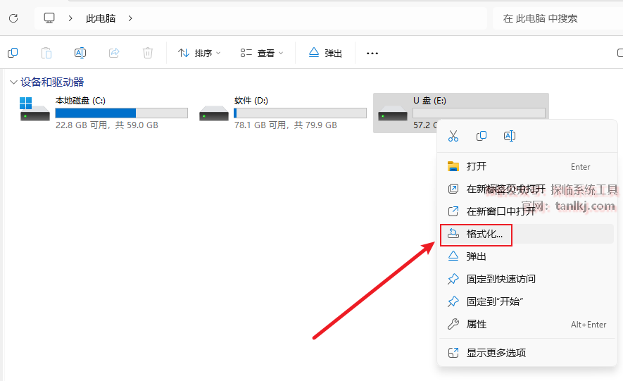 插入U盘(大于8G),右键【U盘】,点击【格式化】。