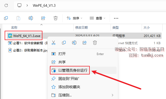 打开解压后的文件夹,右键程序【WePE_64_V1.3】,点击【以管理员身份运行】。