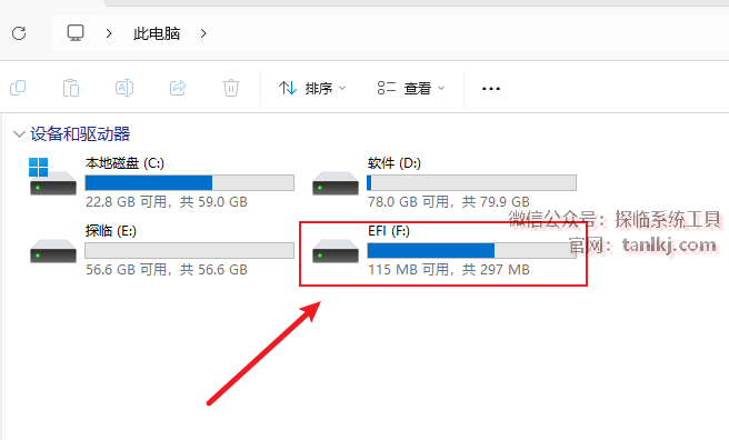 打开【此电脑】,可以看到会多出一个名为【EFI】的盘符。