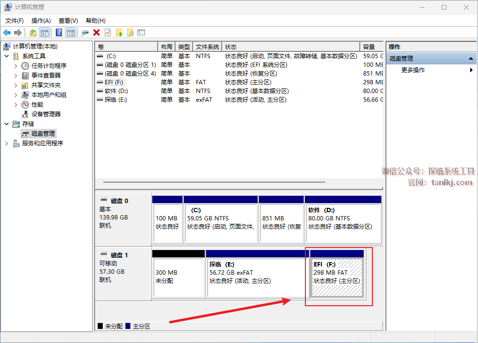 如若没有显示上一步骤中的盘符,可以打开磁盘管理,看下自己的U盘是否多一个名为【EFI】的分区。