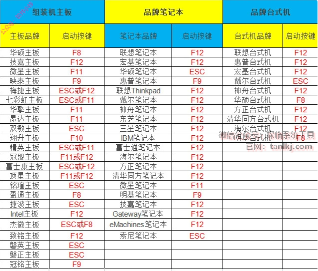 将u盘插进电脑后,重启电脑,电脑屏幕出现画面时,连续多次按下对应的启动热键(各主流机型热键如下图所示),比如F12。