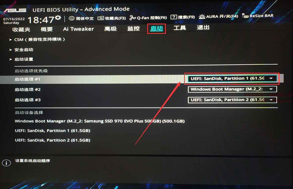 注:不同机型使用的热键、显示的画面及相关设置有所差别,详细具体画面及操作请自行百度搜索,下文使用的是华硕主板组装机进行演示。