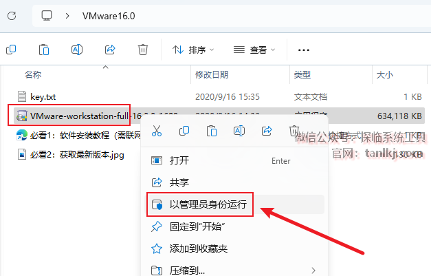 打开解压后的文件夹,右键程序【VMware-workstation…】,点击【以管理员身份运行】。