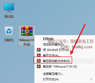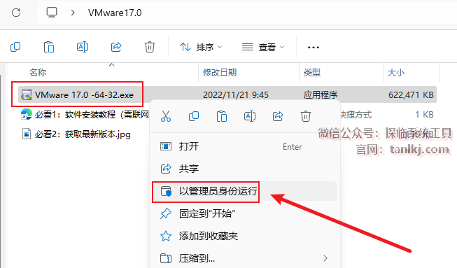 打开解压后的文件夹,右键程序【VMware 17.0…】,点击【以管理员身份运行】。