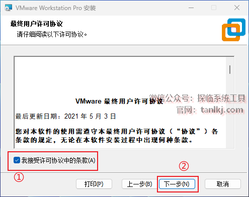①勾选【我接受许可协议中的条款】;