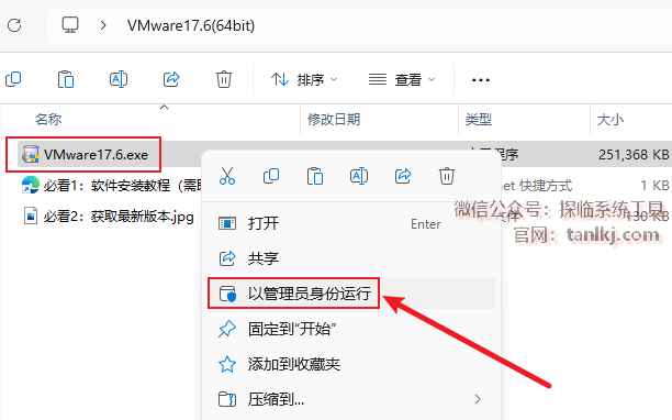 打开解压后的文件夹,右键程序【VMware17.6…】,点击【以管理员身份运行】。